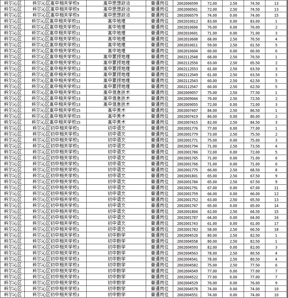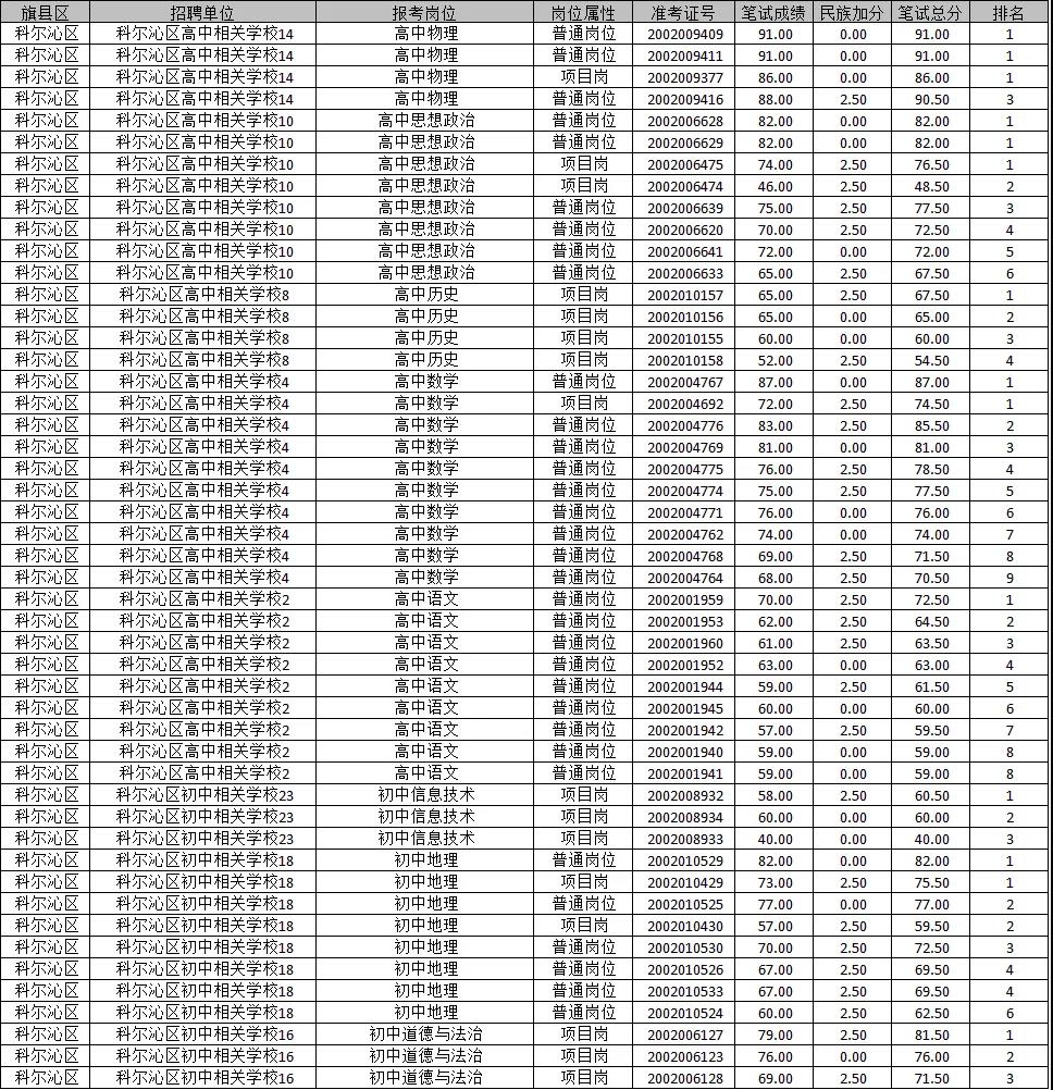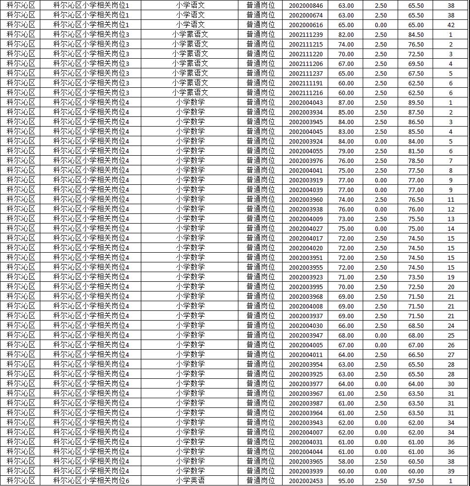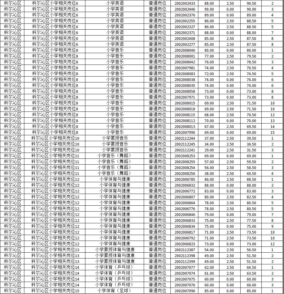 2.有效期內(nèi)二代身份證、戶口簿原件及復(fù)印件(報(bào)名與參加筆試、面試所使用的證件必須一致)。3.畢業(yè)證、學(xué)位證原件和復(fù)印件、在有效期內(nèi)的中國高等教育學(xué)生信息網(wǎng)(http://www.chsi.com.cn)上打印的學(xué)歷認(rèn)證(教育部學(xué)歷證書電子注冊備案表),國外學(xué)歷應(yīng)聘人員須持教育部學(xué)歷認(rèn)證報(bào)告。5.報(bào)考“項(xiàng)目人員”崗位的應(yīng)聘人員,須提供服務(wù)項(xiàng)目證書原件和復(fù)印件或服務(wù)地旗縣級以上主管部門出具的服務(wù)期滿(或服務(wù)起始終止日期)、考核合格(或考核初步意見)的證明原件及復(fù)印件;大學(xué)生退役士兵須提供士兵退役證原件和復(fù)印件;續(xù)聘的農(nóng)村牧區(qū)科技服務(wù)員須提供續(xù)聘合同或旗縣人社部門出具的相關(guān)證明材料。6.應(yīng)聘人員屬于行政單位、事業(yè)單位、企業(yè)職工并簽有勞動合同的,須提交本人所在單位同意報(bào)考的證明及聯(lián)系電話。7.應(yīng)聘人員屬于機(jī)關(guān)事業(yè)單位正式在編工作人員的,須提交本人所在單位同意報(bào)考的證明及單位聯(lián)系電話。8.應(yīng)聘小學(xué)體育(乒乓球)、小學(xué)體育(足球)崗位的人員,須提交本人高校畢業(yè)成績單復(fù)印件,并加蓋檔案存放部門的公章。1.應(yīng)聘人員未在規(guī)定時(shí)間內(nèi)參加資格復(fù)審的,取消面試資格。2.資格復(fù)審重點(diǎn)審核考生所填報(bào)的信息是否真實(shí)準(zhǔn)確,凡所填報(bào)信息與所持證件不符、不符合崗位要求的報(bào)考條件、弄虛作假、因個人原因錯填民族信息導(dǎo)致加分、隱瞞普通全日制教育在讀大學(xué)生或研究生、現(xiàn)役軍人等信息的,一律取消面試資格。3.對資格復(fù)審后出現(xiàn)缺額的崗位,按照筆試成績從高分到低分的順序依次遞補(bǔ)(分?jǐn)?shù)并列的一并進(jìn)入),將電話通知遞補(bǔ)的應(yīng)聘人員參加資格復(fù)審,應(yīng)聘人員報(bào)名時(shí)填寫的電話關(guān)機(jī)或無法接通的,責(zé)任自負(fù)。4.資格復(fù)審人員14日內(nèi)具有疫情中高風(fēng)險(xiǎn)地區(qū)旅居史或出現(xiàn)發(fā)熱、乏力、咳嗽、呼吸困難、腹瀉等病狀,務(wù)必主動告知工作人員,并提供7日內(nèi)核酸檢測陰性證明,對于刻意隱瞞病情或者不如實(shí)報(bào)告發(fā)病史、旅居史和接觸史的人員,將按照有關(guān)法律法規(guī)予以處理。附件:科爾沁區(qū)相關(guān)崗位入圍資格復(fù)審人員名單科爾沁區(qū)相關(guān)崗位入圍資格復(fù)審人員名單