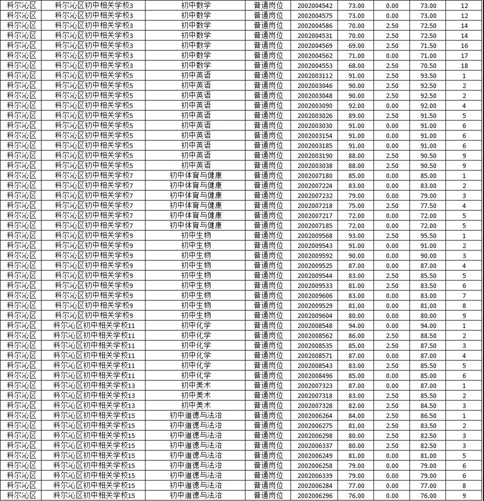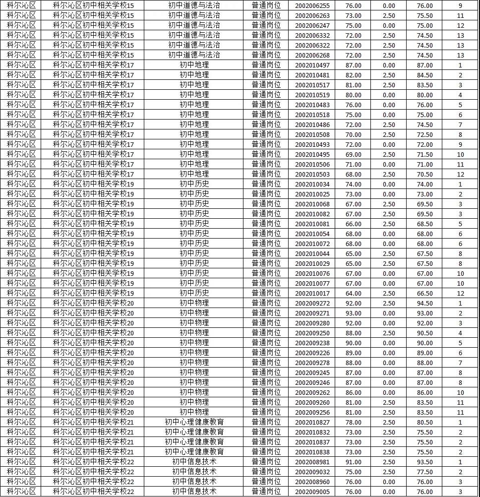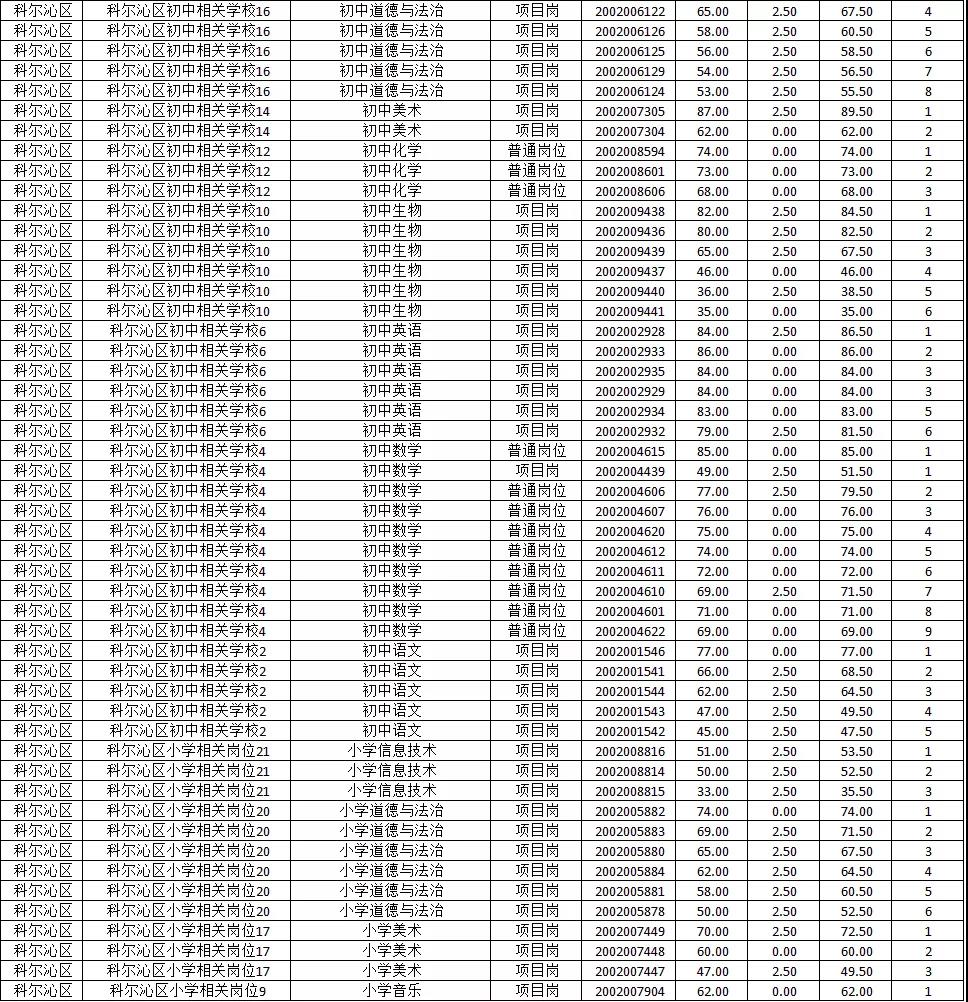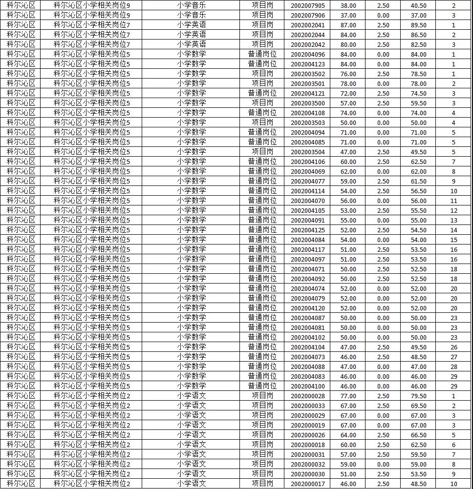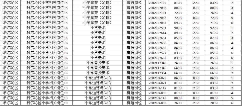 2.有效期內(nèi)二代身份證、戶口簿原件及復(fù)印件(報(bào)名與參加筆試、面試所使用的證件必須一致)。3.畢業(yè)證、學(xué)位證原件和復(fù)印件、在有效期內(nèi)的中國高等教育學(xué)生信息網(wǎng)(http://www.chsi.com.cn)上打印的學(xué)歷認(rèn)證(教育部學(xué)歷證書電子注冊備案表),國外學(xué)歷應(yīng)聘人員須持教育部學(xué)歷認(rèn)證報(bào)告。5.報(bào)考“項(xiàng)目人員”崗位的應(yīng)聘人員,須提供服務(wù)項(xiàng)目證書原件和復(fù)印件或服務(wù)地旗縣級以上主管部門出具的服務(wù)期滿(或服務(wù)起始終止日期)、考核合格(或考核初步意見)的證明原件及復(fù)印件;大學(xué)生退役士兵須提供士兵退役證原件和復(fù)印件;續(xù)聘的農(nóng)村牧區(qū)科技服務(wù)員須提供續(xù)聘合同或旗縣人社部門出具的相關(guān)證明材料。6.應(yīng)聘人員屬于行政單位、事業(yè)單位、企業(yè)職工并簽有勞動合同的,須提交本人所在單位同意報(bào)考的證明及聯(lián)系電話。7.應(yīng)聘人員屬于機(jī)關(guān)事業(yè)單位正式在編工作人員的,須提交本人所在單位同意報(bào)考的證明及單位聯(lián)系電話。8.應(yīng)聘小學(xué)體育(乒乓球)、小學(xué)體育(足球)崗位的人員,須提交本人高校畢業(yè)成績單復(fù)印件,并加蓋檔案存放部門的公章。1.應(yīng)聘人員未在規(guī)定時(shí)間內(nèi)參加資格復(fù)審的,取消面試資格。2.資格復(fù)審重點(diǎn)審核考生所填報(bào)的信息是否真實(shí)準(zhǔn)確,凡所填報(bào)信息與所持證件不符、不符合崗位要求的報(bào)考條件、弄虛作假、因個人原因錯填民族信息導(dǎo)致加分、隱瞞普通全日制教育在讀大學(xué)生或研究生、現(xiàn)役軍人等信息的,一律取消面試資格。3.對資格復(fù)審后出現(xiàn)缺額的崗位,按照筆試成績從高分到低分的順序依次遞補(bǔ)(分?jǐn)?shù)并列的一并進(jìn)入),將電話通知遞補(bǔ)的應(yīng)聘人員參加資格復(fù)審,應(yīng)聘人員報(bào)名時(shí)填寫的電話關(guān)機(jī)或無法接通的,責(zé)任自負(fù)。4.資格復(fù)審人員14日內(nèi)具有疫情中高風(fēng)險(xiǎn)地區(qū)旅居史或出現(xiàn)發(fā)熱、乏力、咳嗽、呼吸困難、腹瀉等病狀,務(wù)必主動告知工作人員,并提供7日內(nèi)核酸檢測陰性證明,對于刻意隱瞞病情或者不如實(shí)報(bào)告發(fā)病史、旅居史和接觸史的人員,將按照有關(guān)法律法規(guī)予以處理。附件:科爾沁區(qū)相關(guān)崗位入圍資格復(fù)審人員名單科爾沁區(qū)相關(guān)崗位入圍資格復(fù)審人員名單