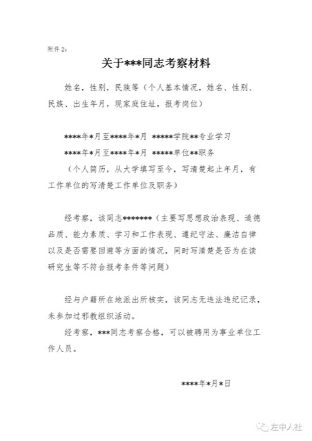 1.科左中旗事業(yè)單位新聘用人員政審表一份,須所在單位、村(居)委會和戶籍所在地派出所出具意見并簽字蓋章(模板見附件1);