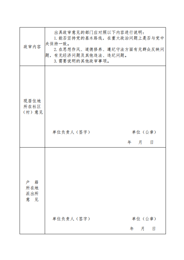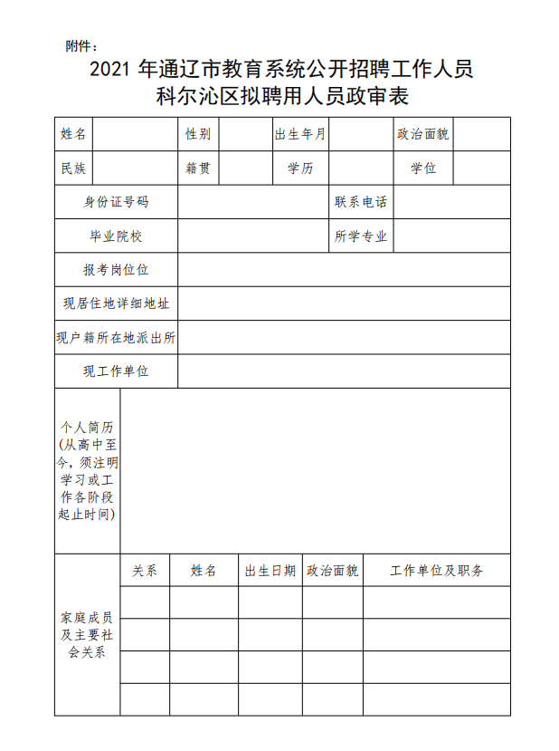 1.在職人員提供《干部人事檔案》,無業(yè)人員提供《學(xué)籍檔案》。3.居住地所在社區(qū)(村委會(huì))和戶籍所在地或居住地轄區(qū)派出所出具的無違法違紀(jì)證明材料,需下載附件《政審表》(此表正反面打印),出具部門填寫意見并簽字蓋章。4.提供中國人民銀行出具的《個(gè)人征信報(bào)告》。5.憑所在院系出具的證明參加資格審核的2021年應(yīng)屆高校畢業(yè)生,須提供畢業(yè)證、學(xué)位證、教師資格證原件及復(fù)印件。6.《教師資格認(rèn)定申請(qǐng)表》原件。1.考察組審核擬聘用人員提供的學(xué)籍檔案(或人事檔案)及相關(guān)證件,了解被考核對(duì)象報(bào)名以來所提供的各類證件、經(jīng)歷是否真實(shí)有效、符合崗位要求。2.通過《政審表》《個(gè)人征信報(bào)告》了解其學(xué)習(xí)工作表現(xiàn)和遵紀(jì)守法等方面的實(shí)際情況。1.考察工作須本人攜帶相關(guān)材料到考察地點(diǎn)現(xiàn)場進(jìn)行,未在指定日期內(nèi)提交考察材料,視為自動(dòng)放棄錄用。2.需要給檔案存放部門致函提取檔案的人員,本人可在8月2日至4日工作時(shí)間內(nèi)持有效二代身份證到區(qū)教體局401辦公室,可配合出具借(調(diào))檔函。附件:2021年通遼市教育系統(tǒng)公開招聘工作人員科爾沁區(qū)相關(guān)崗位政審表