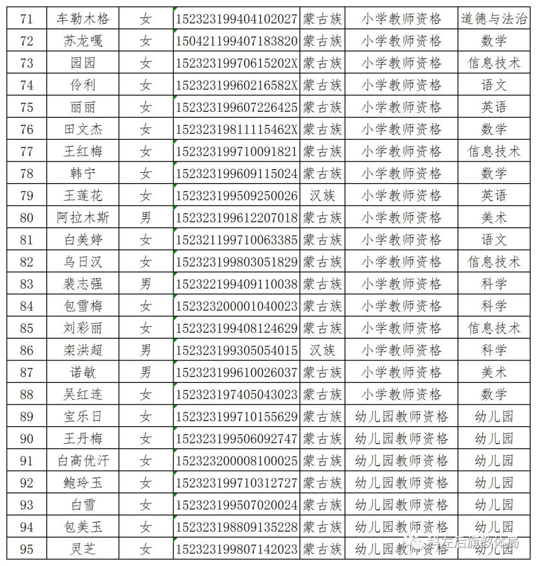 021〕96號)、自治區(qū)教育廳《內蒙古自治區(qū)2021年秋季中小學教師資格認定公告》和市教育局《關于做好2021年秋季教師資格認定工作的通知》(通教教師函〔2021〕144號)要求,為認真做好教師資格認定工作。2021年秋季經過網上報名、體檢、現(xiàn)場確認、非師范教育類人員教學基本素質和能力測試等核查程序,擬對以下95名教師資格申請人員給予認定,現(xiàn)將擬通過人員名單予以公示。公示期2021年12月10日至12月16日,如對認定結果有異議,請致電0475-5210116;0475-5226335。