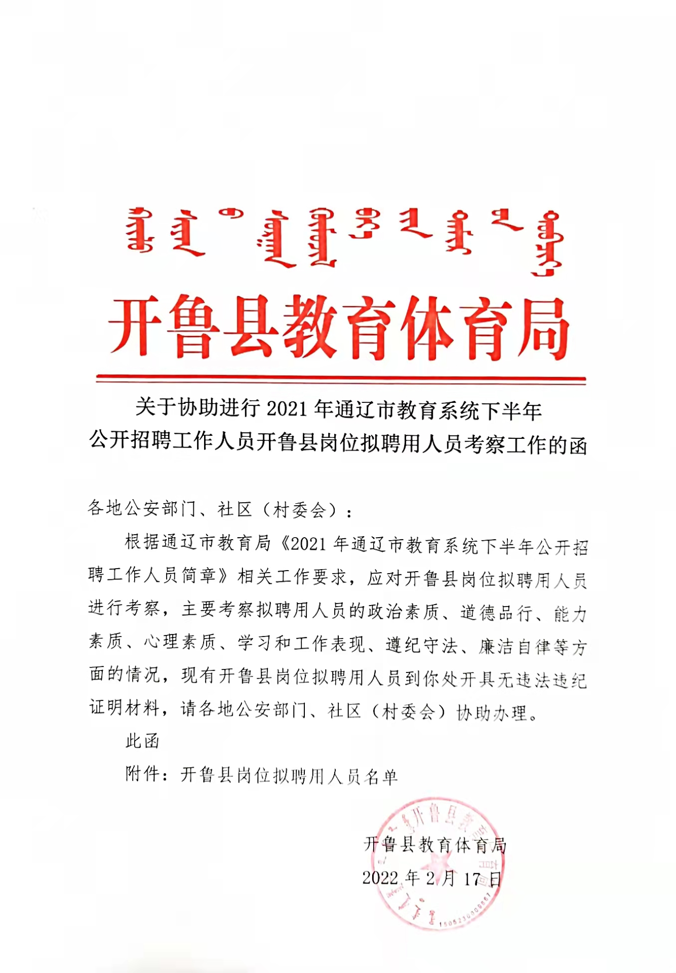 3.居住地所在社區(qū)(村委會)、戶籍所在地或居住地轄區(qū)派出所出具的無違法違紀(jì)證明材料,出具部門填寫意見并簽字蓋章。(請待考察人員下載《關(guān)于協(xié)助進(jìn)行2021年通遼市教育系統(tǒng)下半年公開招聘工作人員開魯縣崗位擬聘用人員考察工作的函》及《政審表》)