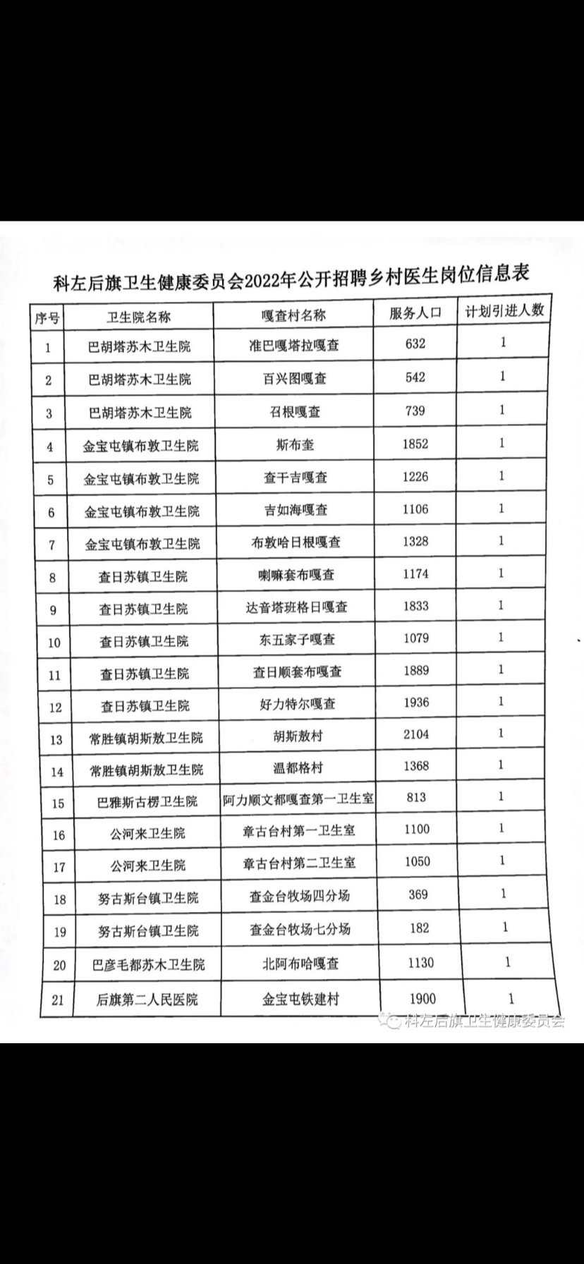 本次招聘崗位、數(shù)量、資格條件和相關(guān)信息在“科左后旗衛(wèi)生健康委員會”微信公眾號上發(fā)布,內(nèi)容詳見《科左后旗衛(wèi)生健康委員會2022年公開招聘鄉(xiāng)村醫(yī)生崗位信息表》(以下簡稱《崗位信息表》)。
