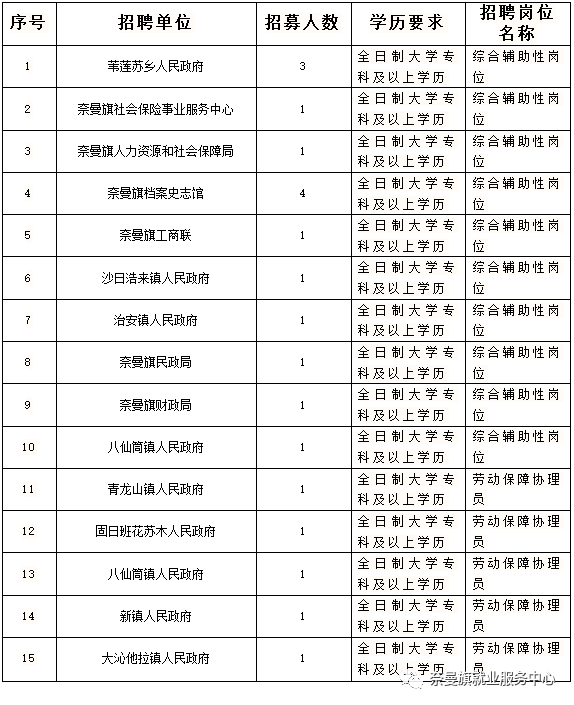 (一)離校兩年及兩年以上從未就業(yè)高校畢業(yè)生:從未就業(yè)指從未在市場(chǎng)監(jiān)督管理部門(mén)領(lǐng)取營(yíng)業(yè)執(zhí)照或在公司等實(shí)體中擔(dān)任股東等職務(wù)、從未在民政部門(mén)辦理民辦非企業(yè)登記證、從未在勞動(dòng)就業(yè)子系統(tǒng)中進(jìn)行過(guò)就業(yè)登記、從未繳納過(guò)城鎮(zhèn)職工基本養(yǎng)老保險(xiǎn)。(二)持有《中華人民共和國(guó)殘疾人證》的殘疾高校畢業(yè)生。(三)正在享受最低生活保障待遇期間,且連續(xù)失業(yè)登記1年以上女滿35周歲、男滿45周歲的失業(yè)高校畢業(yè)生。(一)報(bào)名者應(yīng)具備以下資格條件1.擁護(hù)中華人民共和國(guó)憲法,擁護(hù)中國(guó)共產(chǎn)黨領(lǐng)導(dǎo)和社會(huì)主義制度;3.具有正常履行職責(zé)的身體條件和心理素質(zhì);(二)每位報(bào)名者只能應(yīng)聘一個(gè)職位,報(bào)名者填寫(xiě)學(xué)歷、學(xué)位時(shí),要填寫(xiě)全日制學(xué)歷、學(xué)位。填寫(xiě)所學(xué)專業(yè)時(shí),要嚴(yán)格按照本人畢業(yè)證書(shū)上的專業(yè)名稱填寫(xiě),并確保所填專業(yè)符合應(yīng)聘崗位專業(yè)要求。(三)離校2年及以上從未就業(yè)的就業(yè)困難高校畢業(yè)生畢業(yè)證書(shū)取得時(shí)間須在2020年7月31日前。在讀普通高校全日制??粕?、本科生、研究生不得報(bào)名。(一)報(bào)名及資格初審時(shí)間:即日起至2022年8月29日17:30(節(jié)假日休息)(二)資格初審:奈曼旗人力資源和就業(yè)服務(wù)中心對(duì)報(bào)名的應(yīng)聘人員進(jìn)行資格初審,現(xiàn)場(chǎng)通過(guò)勞動(dòng)就業(yè)核心業(yè)務(wù)經(jīng)辦子系統(tǒng)和“內(nèi)蒙古自治區(qū)社會(huì)保險(xiǎn)管理信息系統(tǒng)”對(duì)報(bào)名的應(yīng)聘人員學(xué)歷情況、畢業(yè)證信息、就業(yè)失業(yè)狀態(tài)以及是否享受就業(yè)困難人員援助政策(包括社會(huì)保險(xiǎn)補(bǔ)貼和公益性崗位補(bǔ)貼)、參加工傷或者失業(yè)保險(xiǎn)、領(lǐng)取營(yíng)業(yè)執(zhí)照或民辦非企業(yè)單位證書(shū)等情況進(jìn)行精準(zhǔn)核查。1.自行打印報(bào)名表(見(jiàn)附件),一式一份。2.本人身份證、戶口本、畢業(yè)證書(shū)原件及復(fù)印件,本人近期免冠二寸照片兩張。3.提供在奈曼旗城鎮(zhèn)居住6個(gè)月(含)以上證明材料。4.殘疾高校畢業(yè)生需提供《中華人民共和國(guó)殘疾人證》。5.享受低保的長(zhǎng)期失業(yè)高校畢業(yè)生需提供低保證明材料和失業(yè)登記證明材料。資格初審合格后的報(bào)名人員統(tǒng)一進(jìn)行失業(yè)登記和就業(yè)困難人員認(rèn)定(已進(jìn)行失業(yè)登記和就業(yè)困難人員認(rèn)定的除外)。逾期未進(jìn)行就業(yè)困難人員認(rèn)定的,視同放棄聘用資格。常住社區(qū)按照《內(nèi)蒙古自治區(qū)就業(yè)困難人員認(rèn)定辦法的通知》給予就業(yè)困難人員認(rèn)定,對(duì)未能認(rèn)定就業(yè)困難人員的,取消報(bào)名資格。奈曼旗人力資源和就業(yè)服務(wù)中心將符合條件人員材料交由用人單位,用人單位對(duì)符合條件人員進(jìn)行資格審核,達(dá)到標(biāo)準(zhǔn)雙向選擇,達(dá)成意向后確定擬用人選。選崗現(xiàn)場(chǎng),應(yīng)聘人員現(xiàn)場(chǎng)領(lǐng)取選崗確認(rèn)書(shū),并在選崗確認(rèn)書(shū)上簽字。因應(yīng)聘人員自身原因未在規(guī)定時(shí)間內(nèi)進(jìn)行選崗的,視為放棄選崗資格。自愿放棄選崗資格的,現(xiàn)場(chǎng)簽署放棄選崗資格聲明。最終選用上崗人員由用人單位確定,最終解釋權(quán)歸用人單位所有。 為提高擬聘用人員的技能水平,使其盡早適應(yīng)崗位要求,本次招聘將集中開(kāi)展崗前培訓(xùn)。就業(yè)困難人員認(rèn)定結(jié)束后,擬聘用人員需持《就業(yè)創(chuàng)業(yè)證》到定點(diǎn)培訓(xùn)機(jī)構(gòu)報(bào)到參加培訓(xùn),培訓(xùn)期間不得遲到、早退、請(qǐng)假、曠課。未按規(guī)定要求參加培訓(xùn)的、崗前培訓(xùn)不及格的、培訓(xùn)結(jié)業(yè)考試不及格的,取消聘用資格。培訓(xùn)時(shí)間、地點(diǎn):另行通知通過(guò)就業(yè)困難人員認(rèn)定的擬聘用人員在奈曼旗人力資源和就業(yè)服務(wù)中心微信公眾號(hào)上進(jìn)行公示,公示期為5個(gè)工作日。(一)公示期滿,沒(méi)有問(wèn)題或者反映問(wèn)題不影響聘用的,用人單位與其簽訂公益性崗位勞動(dòng)合同,公益性崗位合同期限為3年。對(duì)反映問(wèn)題嚴(yán)重并查有實(shí)據(jù)的,取消聘用資格。(二)公益性崗位人員薪酬待遇標(biāo)準(zhǔn)不低于奈曼旗最低工資標(biāo)準(zhǔn),用人單位給予的實(shí)際薪酬待遇以公益性崗位合同約定為準(zhǔn)。用人單位為公益性崗位人員依法繳納社會(huì)保險(xiǎn)。(三)非因用人單位原因,擬聘用人員未在規(guī)定時(shí)間內(nèi)與用人單位簽訂公益性崗位勞動(dòng)合同的,取消聘用資格。應(yīng)聘人員在招聘工作期間要隨時(shí)關(guān)注奈曼旗人力資源和就業(yè)服務(wù)中心公眾號(hào)并保持電話通訊暢通。因個(gè)人原因造成的信息接收溝通不暢而影響資格審查或聘用的,責(zé)任自行承擔(dān)。應(yīng)聘人員資格審查工作貫穿于招聘工作全過(guò)程,招