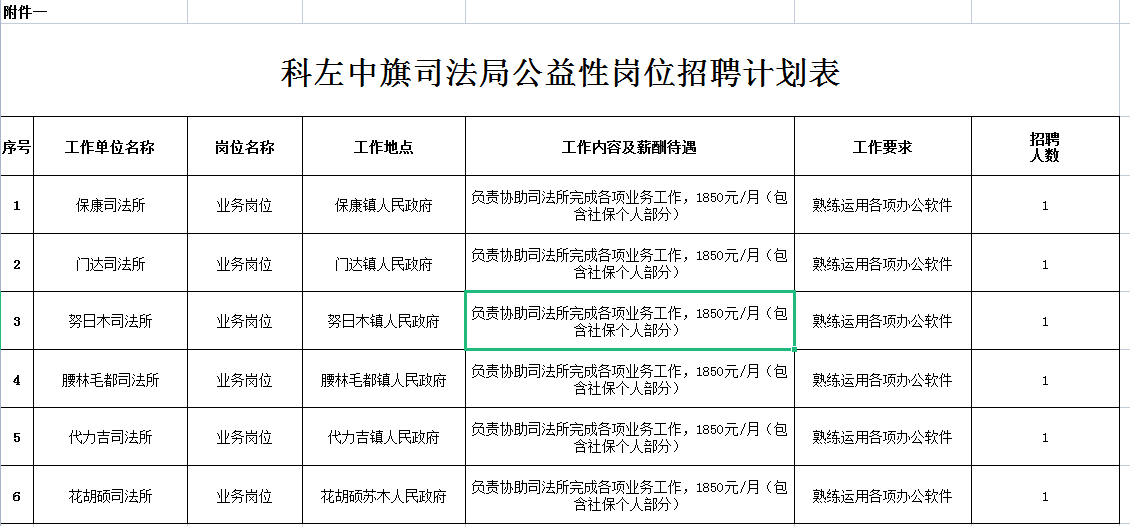 為進(jìn)一步貫徹落實(shí)國務(wù)院、內(nèi)蒙古自治區(qū)、通遼市關(guān)于穩(wěn)就業(yè)保就業(yè)的決策部署,切實(shí)做好就業(yè)困難人員就業(yè)援助工作,根據(jù)通遼市人力資源和社會(huì)保障局《轉(zhuǎn)發(fā)<關(guān)于進(jìn)一步做好公益性崗位開發(fā)管理有關(guān)工作的通知>的通知》(通人社辦發(fā)〔2020〕97號(hào))《關(guān)于進(jìn)一步規(guī)范公益性崗位開發(fā)管理流程的通知》(通人社辦發(fā)〔2021〕204號(hào))《關(guān)于轉(zhuǎn)發(fā)內(nèi)蒙古自治區(qū)<就業(yè)和失業(yè)登記管理辦法>和<就業(yè)困難人員認(rèn)定辦法>的通知》(通人社辦發(fā)〔2020〕86號(hào))及科左中旗人力資源和社會(huì)保障局《關(guān)于印發(fā)2023年公益性崗位開發(fā)工作實(shí)施方案》(左人社字〔2023〕30號(hào))要求,面向社會(huì)公開招聘科左中旗司法局公益性崗位人員6名。現(xiàn)將有關(guān)事項(xiàng)公告如下: