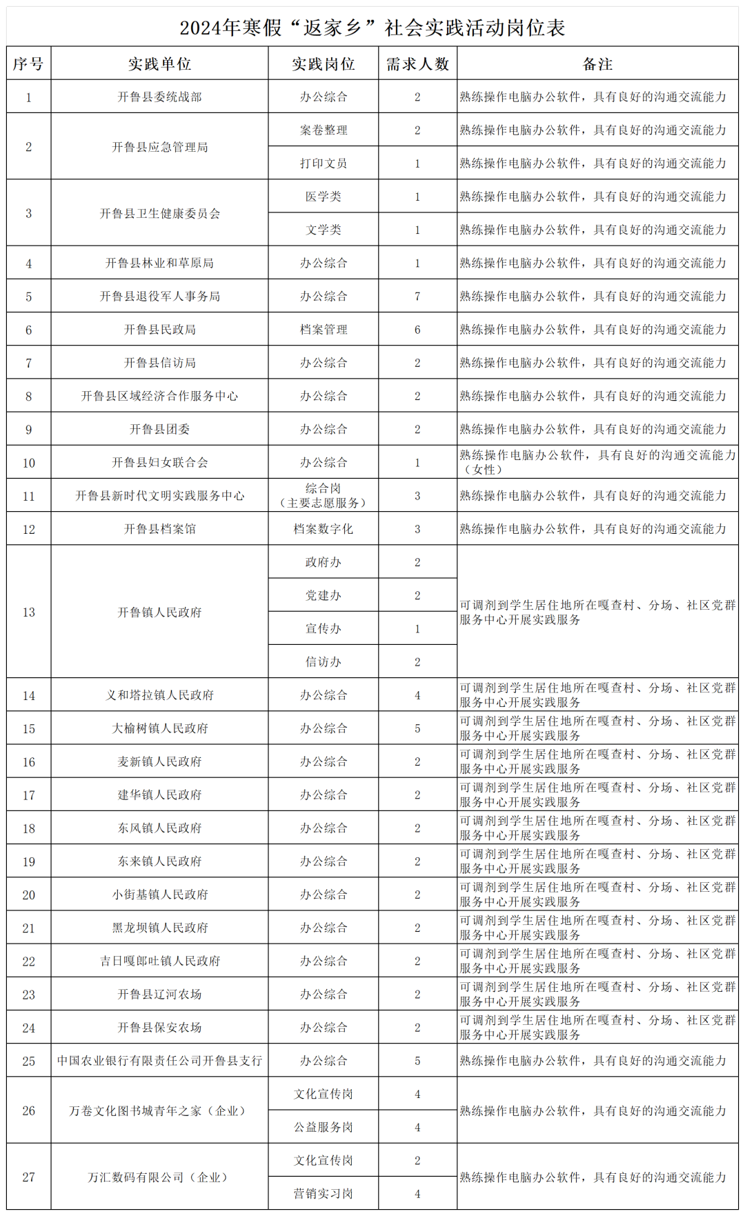 為深入學(xué)習(xí)貫徹習(xí)近平總書記在同團(tuán)中央新一屆領(lǐng)導(dǎo)班子集體談話時(shí)的重要講話精神,堅(jiān)持“受教育、長才干、作貢獻(xiàn)”的宗旨,團(tuán)縣委決定招募開魯籍大學(xué)生寒假期間到機(jī)關(guān)、各鎮(zhèn)場、社區(qū)等領(lǐng)域參與社會(huì)實(shí)踐,動(dòng)員大學(xué)生就近就便到嘎查村、網(wǎng)格報(bào)道,開展“感黨恩、聽黨話、跟黨走”為主題的社會(huì)實(shí)踐活動(dòng),旨在引領(lǐng)廣大青年在奉獻(xiàn)家鄉(xiāng)中增長自身才干,感悟家鄉(xiāng)變化,引領(lǐng)身邊群眾深刻感悟習(xí)近平新時(shí)代中國特色社會(huì)主義思想的磅礴偉力,帶動(dòng)身邊群眾感黨恩、聽黨話、跟黨走,用實(shí)際行動(dòng)踐行新時(shí)代青年學(xué)子的使命擔(dān)當(dāng)。