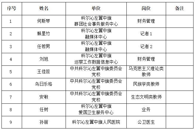 根據(jù)《2024年第一批次科左中旗事業(yè)單位公開招聘工作人員公告》要求,經(jīng)過報(bào)名、資格初審、筆試、資格復(fù)審、面試(試講)、體檢、考察等環(huán)節(jié),現(xiàn)對(duì)何斯琴等40名擬聘用人員予以公示。公示時(shí)間為2024年1月15日至1月19日。公示期間如對(duì)公示情況有異議,請(qǐng)署名實(shí)事求是反映問題并提供必要的調(diào)查線索及相關(guān)證明材料。