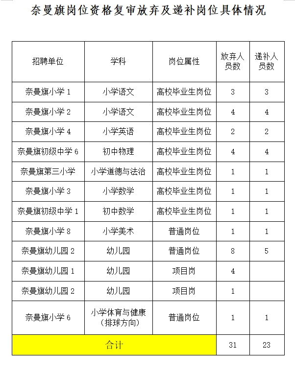 根據(jù)《2024年度通遼市教育系統(tǒng)公開招聘工作人員簡(jiǎn)章》要求,經(jīng)過資格復(fù)審環(huán)節(jié),部分崗位出現(xiàn)人員放棄情況,現(xiàn)需對(duì)崗位進(jìn)行依次遞補(bǔ)(末位分?jǐn)?shù)相同一并進(jìn)入遞補(bǔ)環(huán)節(jié)),具體情況如下: